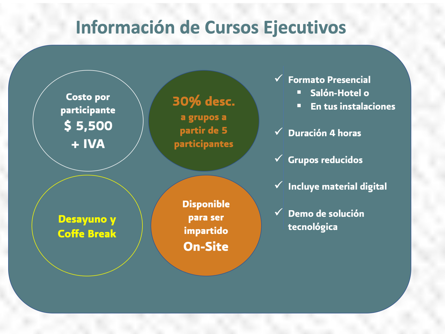 TE PRESENTAMOS LA LISTA DE CURSOS QUE IMPARTIMOS, YA SEA ON-LINE O EN TUS INSTALACIONES. PARA GARANTIZAR LA CALIDAD DEL PROCESO DE APRENDIZAJE, TODOS NUESTROS CURSOS SE IMPARTEN DESDE 3 Y HASTA 10 PERSONAS.